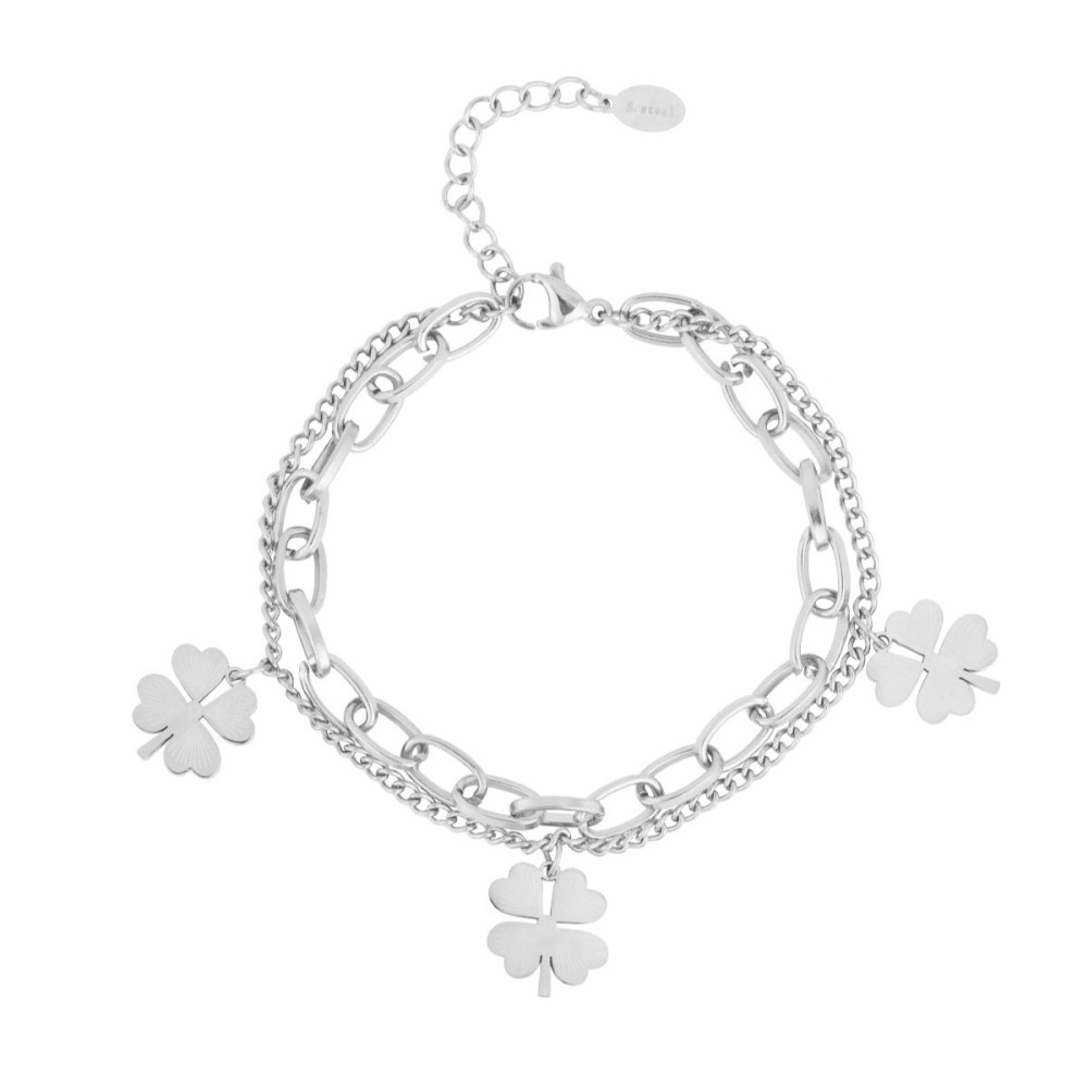 Lucky Me Bracelet argenté double chaîne et trèfles porte-bonheur