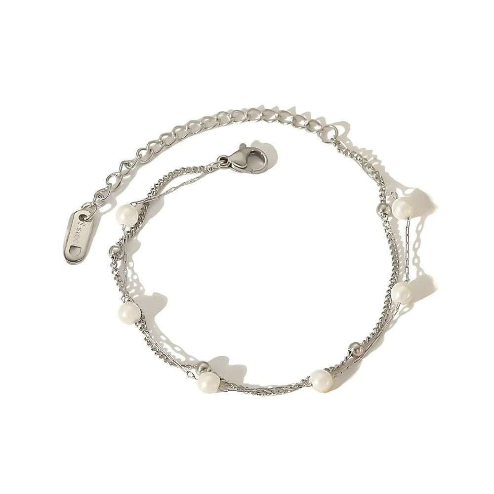 Apportez une note précieuse à votre look avec ce bracelet argenté ponctué de perles raffinées. Sa beauté intemporelle et son caractère délicat en font le compagnon parfait de vos moments d'exception, du bureau aux événements les plus chics